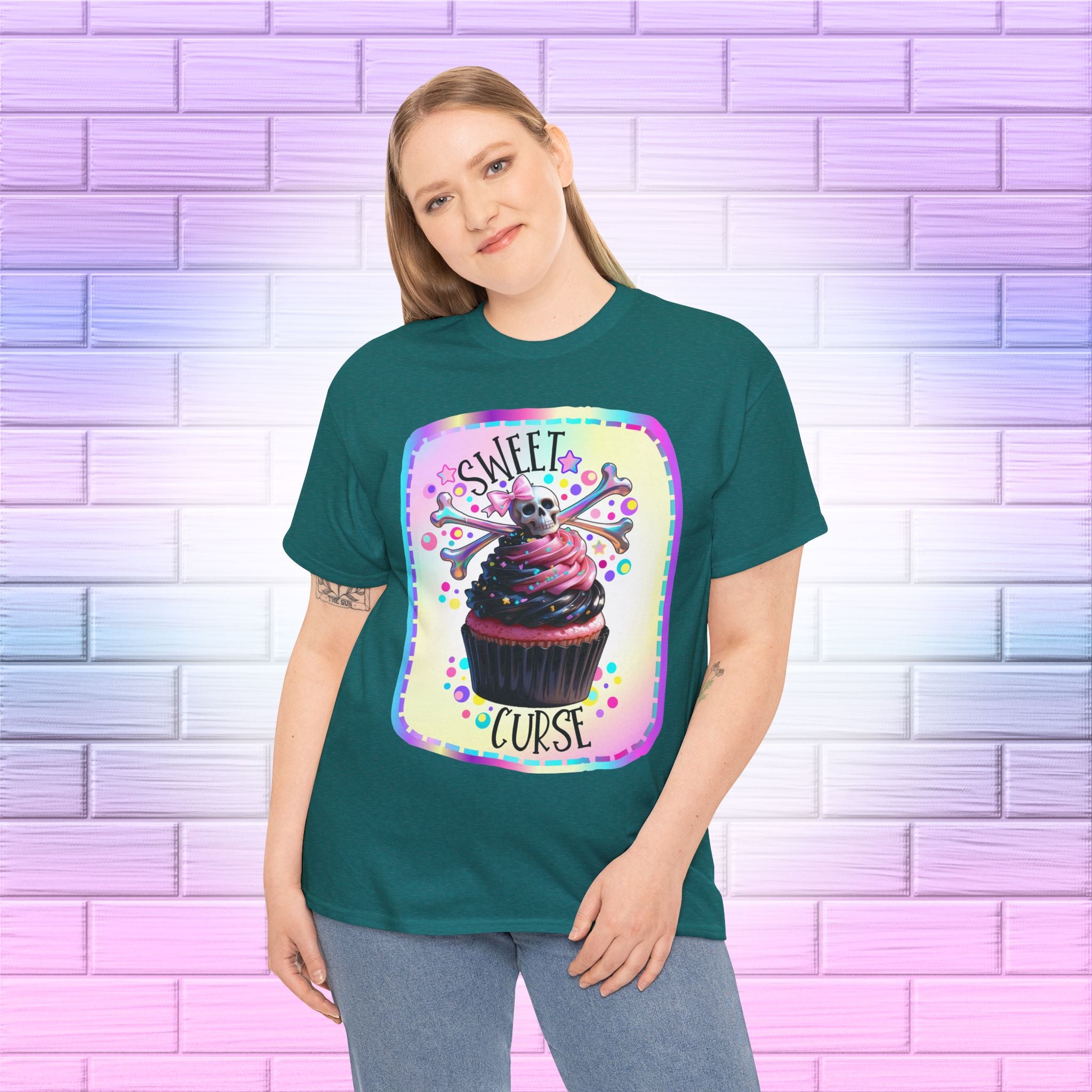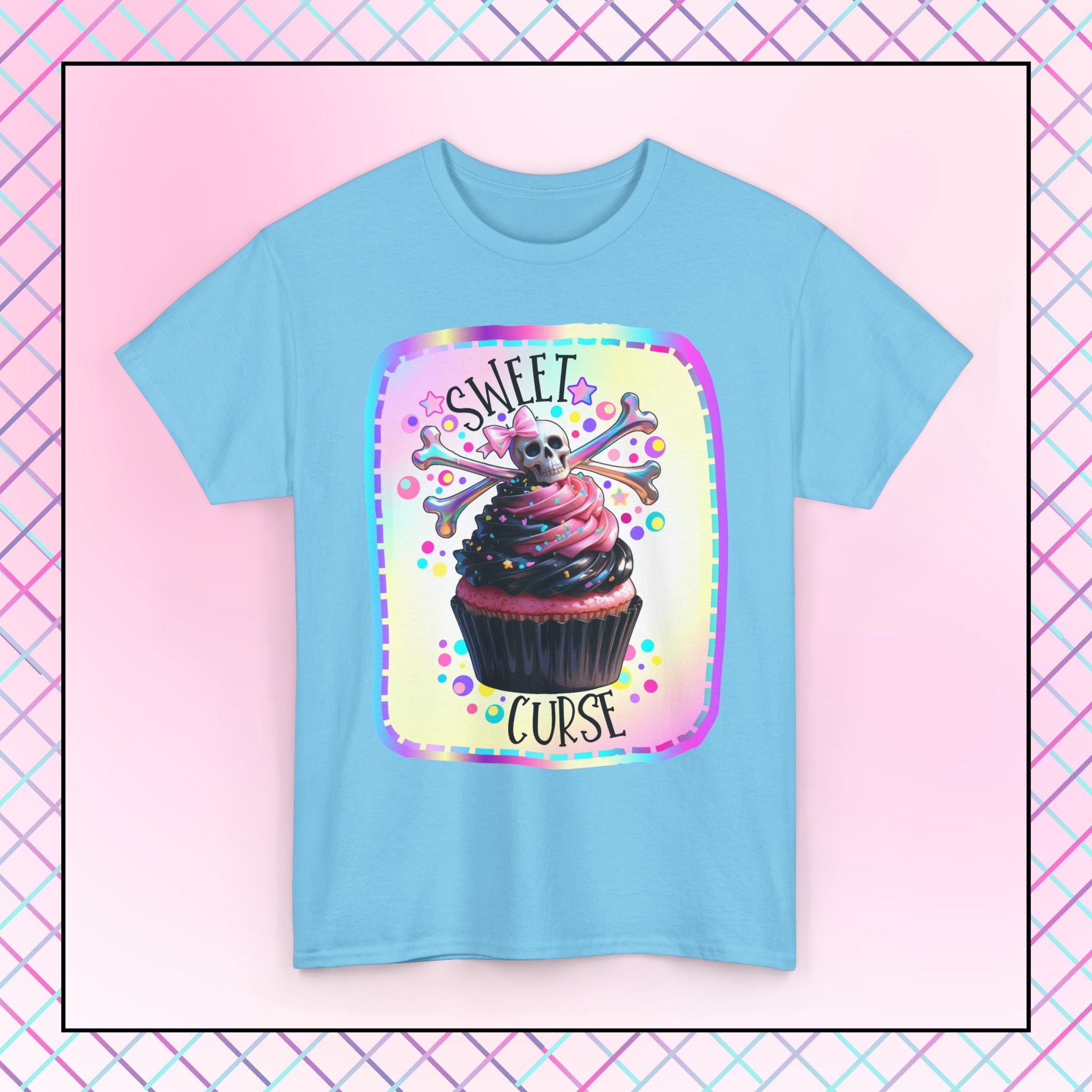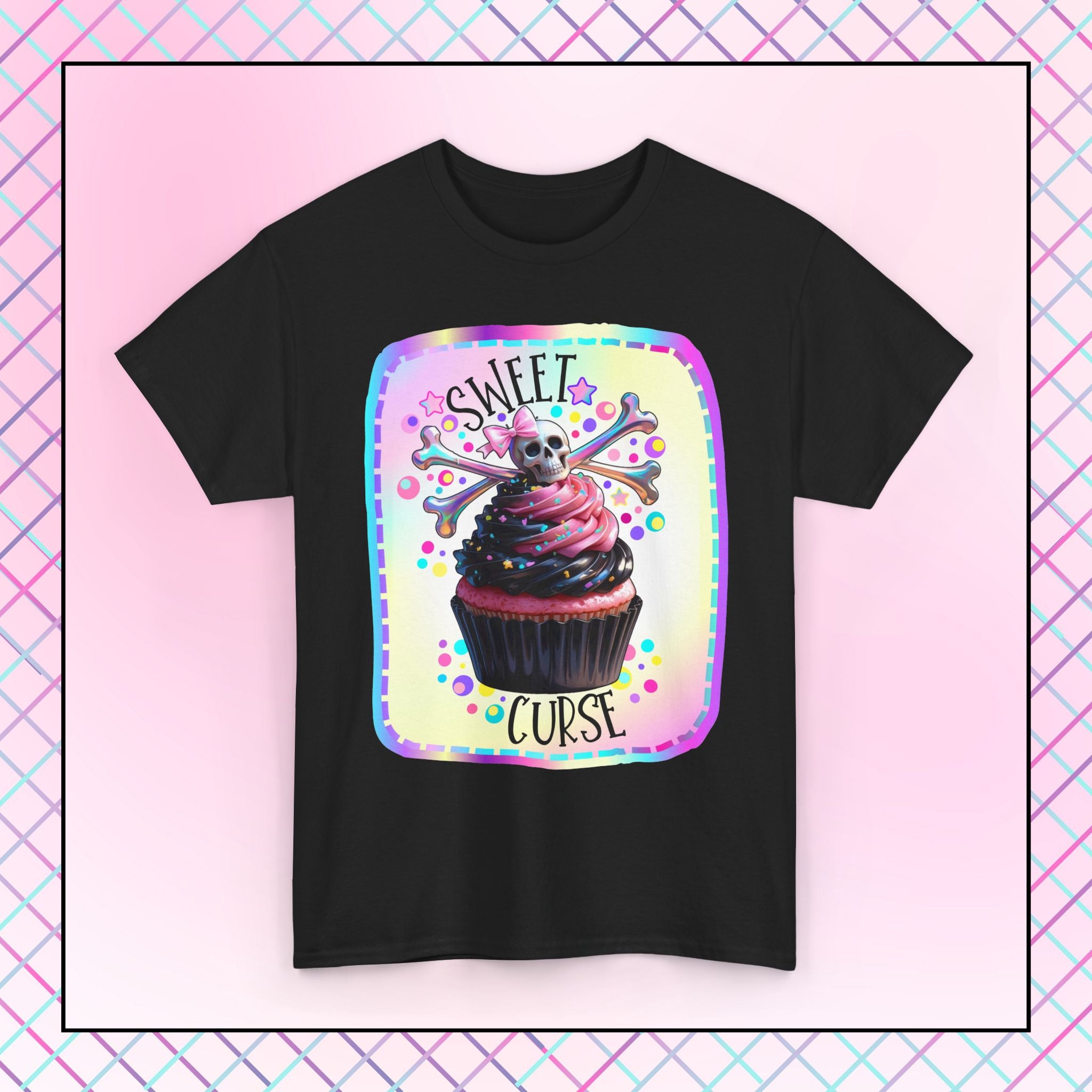 Indulge your dark side with the Sweet Curse Skull n Crossbones Cupcake Tee — where gothic vibes meet irresistible kawaii sweetness. Featuring a two-tone swirl strawberry cupcake topped with a chromatic skull and crossbones, this bold design is equal parts cute and wicked.- Ribbed knit collar for shape retention