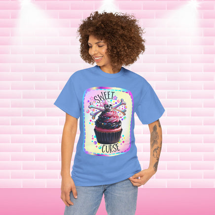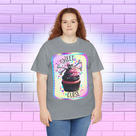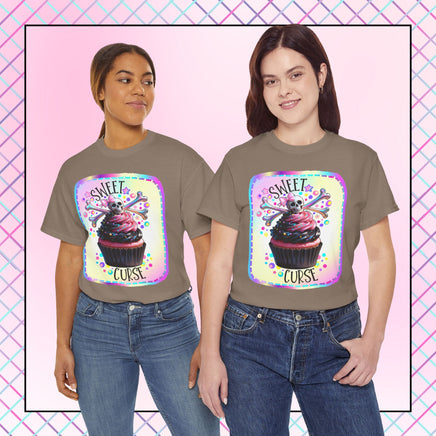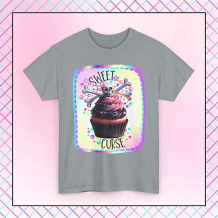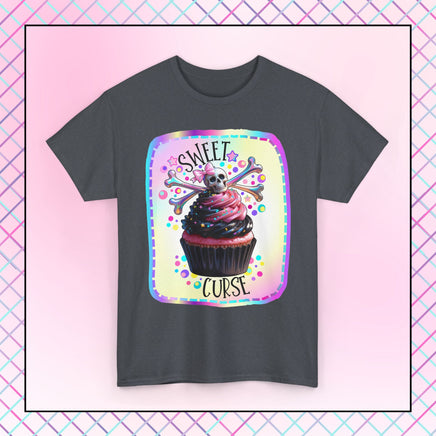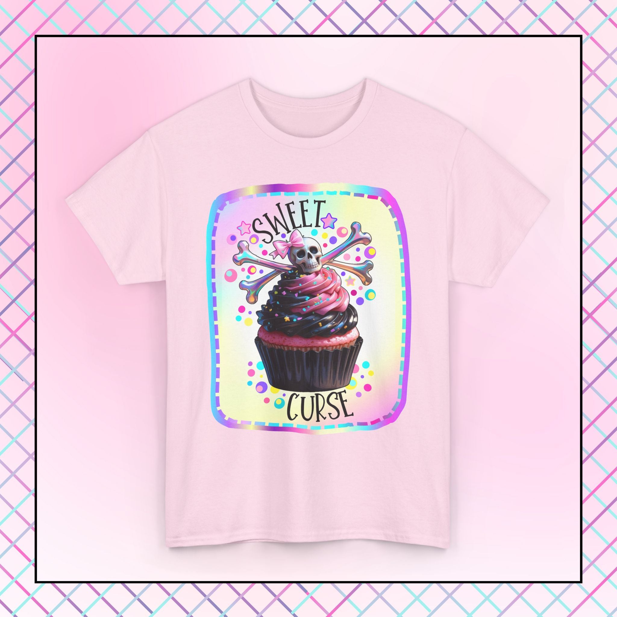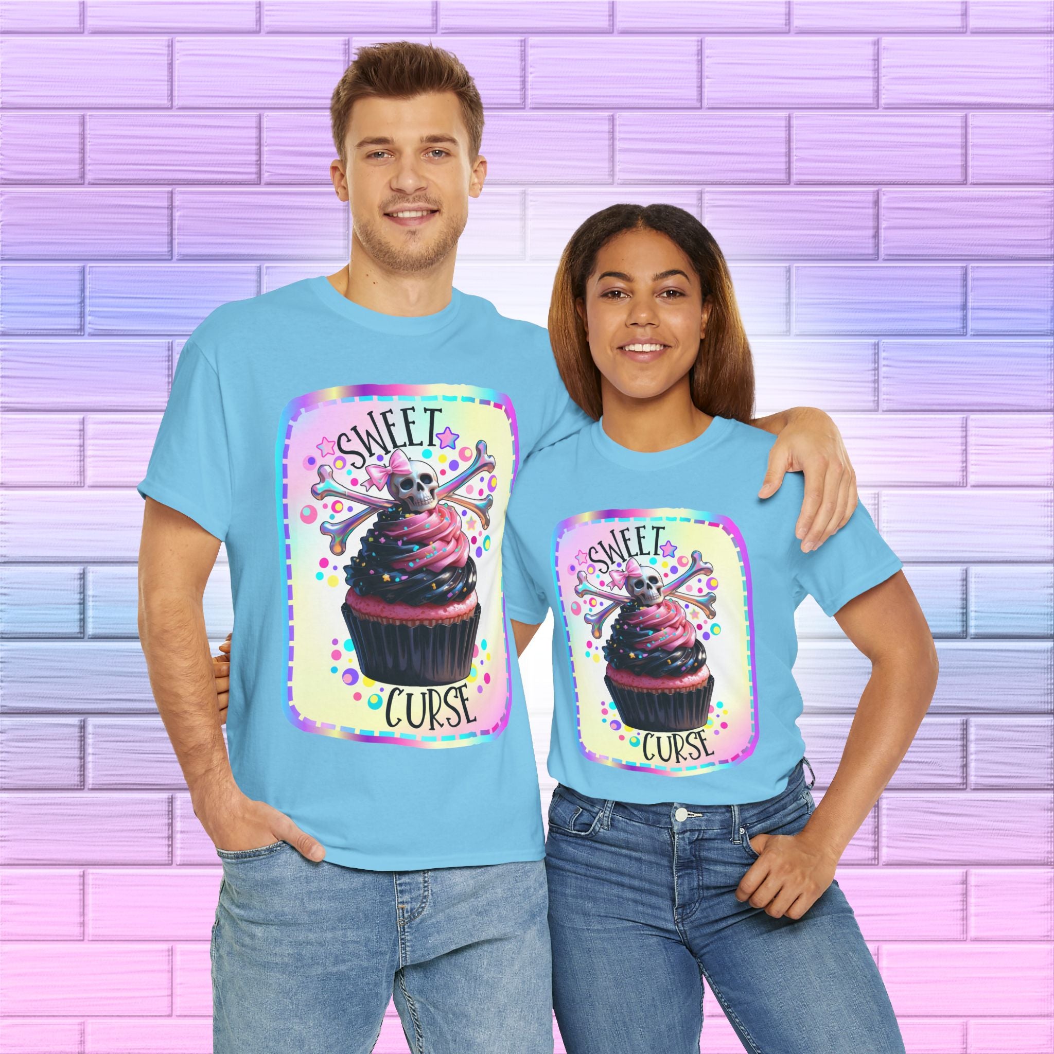 Indulge your dark side with the Sweet Curse Skull n Crossbones Cupcake Tee — where gothic vibes meet irresistible kawaii sweetness. Featuring a two-tone swirl strawberry cupcake topped with a chromatic skull and crossbones, this bold design is equal parts cute and wicked.- Ribbed knit collar for shape retention