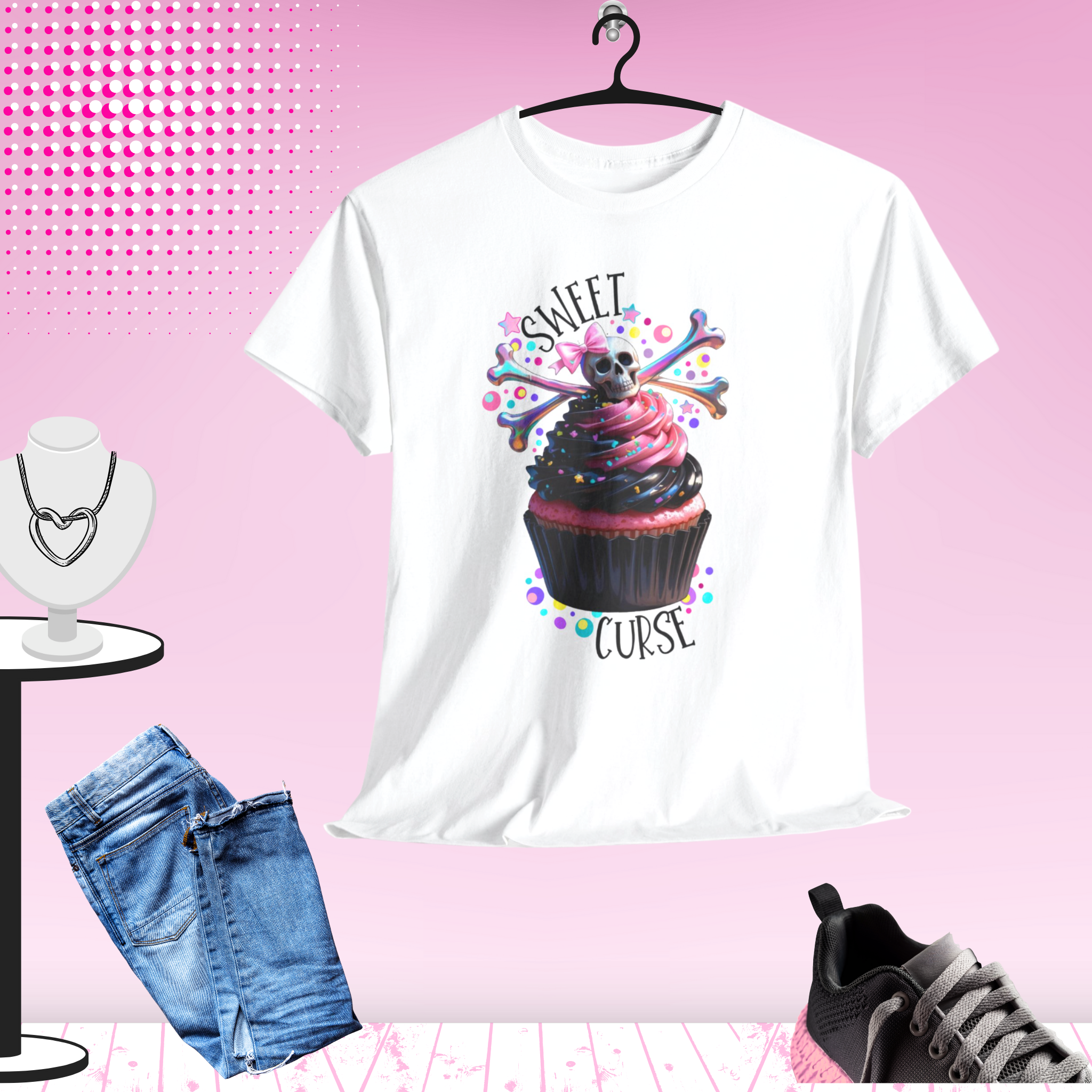 Indulge your dark side with the Sweet Curse Skull n Crossbones Cupcake Tee — where gothic vibes meet irresistible kawaii sweetness. Featuring a two-tone swirl strawberry cupcake topped with a chromatic skull and crossbones, this bold design is equal parts cute and wicked.- Ribbed knit collar for shape retention